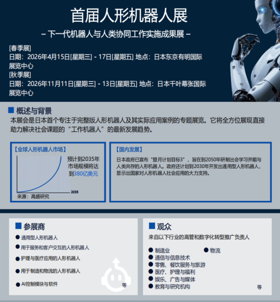本届展会亮点,新增人形机器人专题展览,为日本首个专注于完整版人形机器人及其实际应用案例的专题展览。